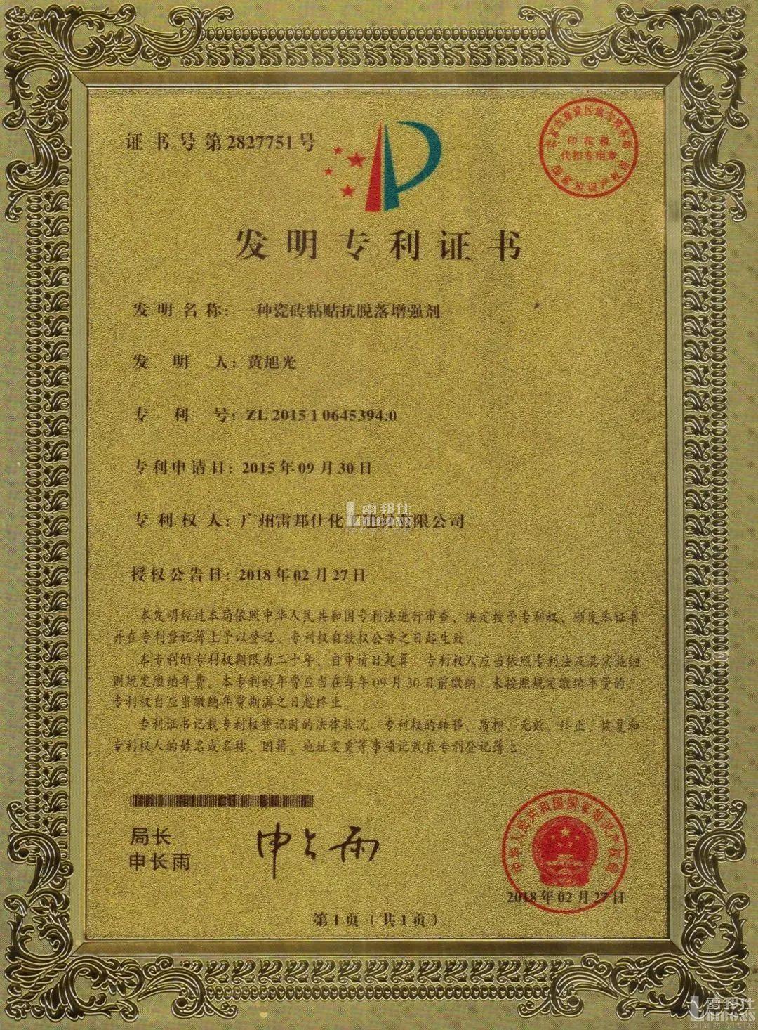 2015年,雷邦仕獲得“瓷磚背膠”國(guó)家發(fā)明專利。雷邦仕推出3款瓷磚背膠產(chǎn)品,分別是502瓷磚背膠、502瓷磚背膠(即刷即貼型)和502大板背膠。