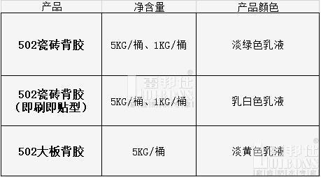 瓷磚背膠使用在瓷磚膠之前,普通型502瓷磚背膠(綠桶)需要等待干透后再用瓷磚膠粘貼瓷磚;即刷即貼型502瓷磚背膠(梅紅桶)可以直接用瓷磚膠粘貼瓷磚,等待時(shí)間更短;502大板背膠(藍(lán)桶)是針對(duì)大塊瓷磚所推出的瓷磚背膠產(chǎn)品。